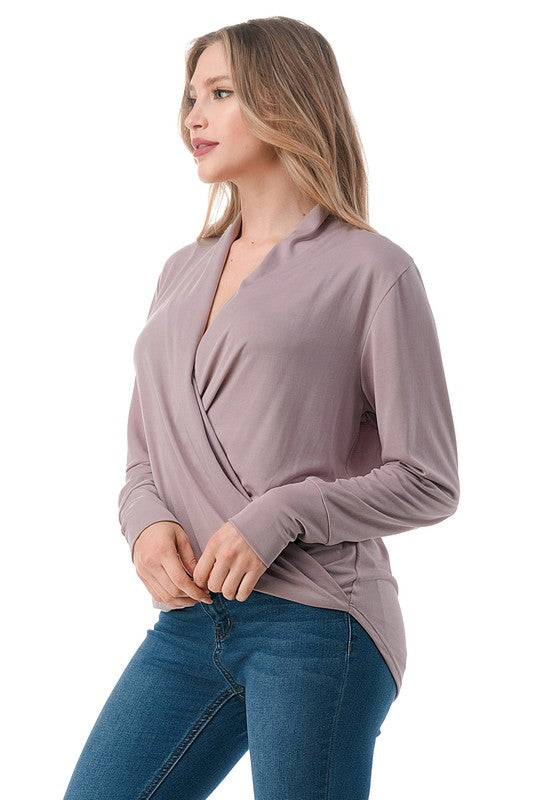 Effortlessly elegant and endlessly versatile, this surplice top features a flattering V-neckline and a classic wrap-style silhouette. Crafted from soft, stretchy fabric, it hugs your shape while offering all-day comfort. The long sleeves add a touch of sophistication, making it perfect for both work and weekend wear. Dress it up with tailored trousers or keep it casual with your favorite jeans—this top does it all.