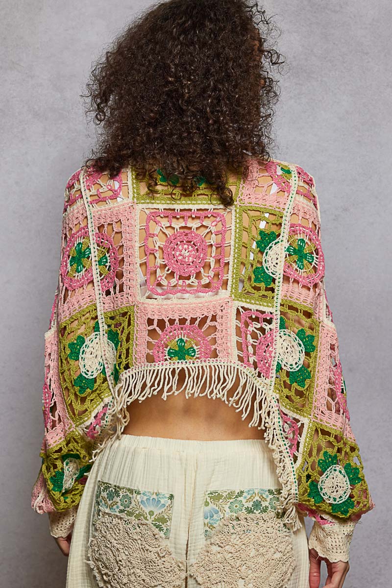 Add a boho-chic touch to your wardrobe with this round neck, long sleeve cropped top. Crafted in soft crochet with a mix of intricate weave knit patterns, it features fringe detailing that adds effortless movement and style. Perfect for layering over bralettes or pairing with high-rise bottoms for a festival-ready look.