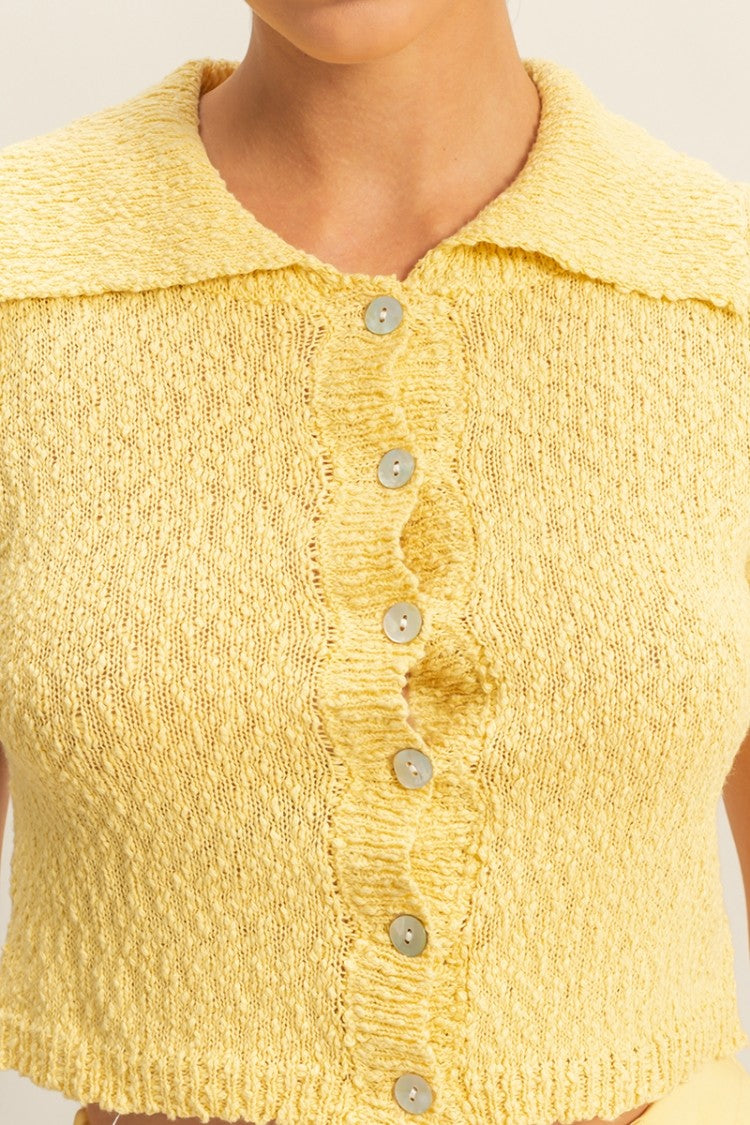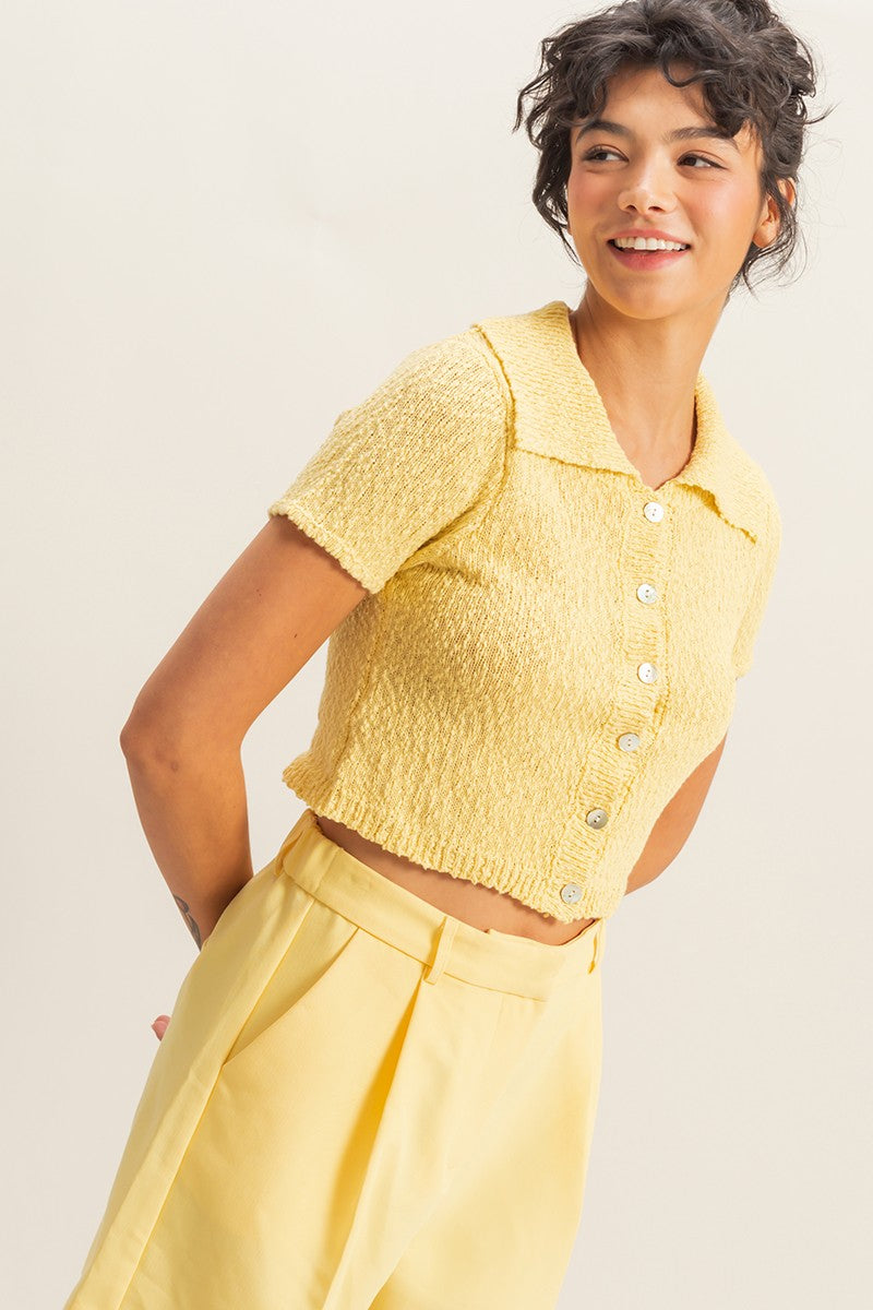 The Vivianna Sweater Top offers sophisticated versatility with its tailored collar and strategic crop length. The button-front closure provides adjustable styling options while the short sleeves create a balanced silhouette.