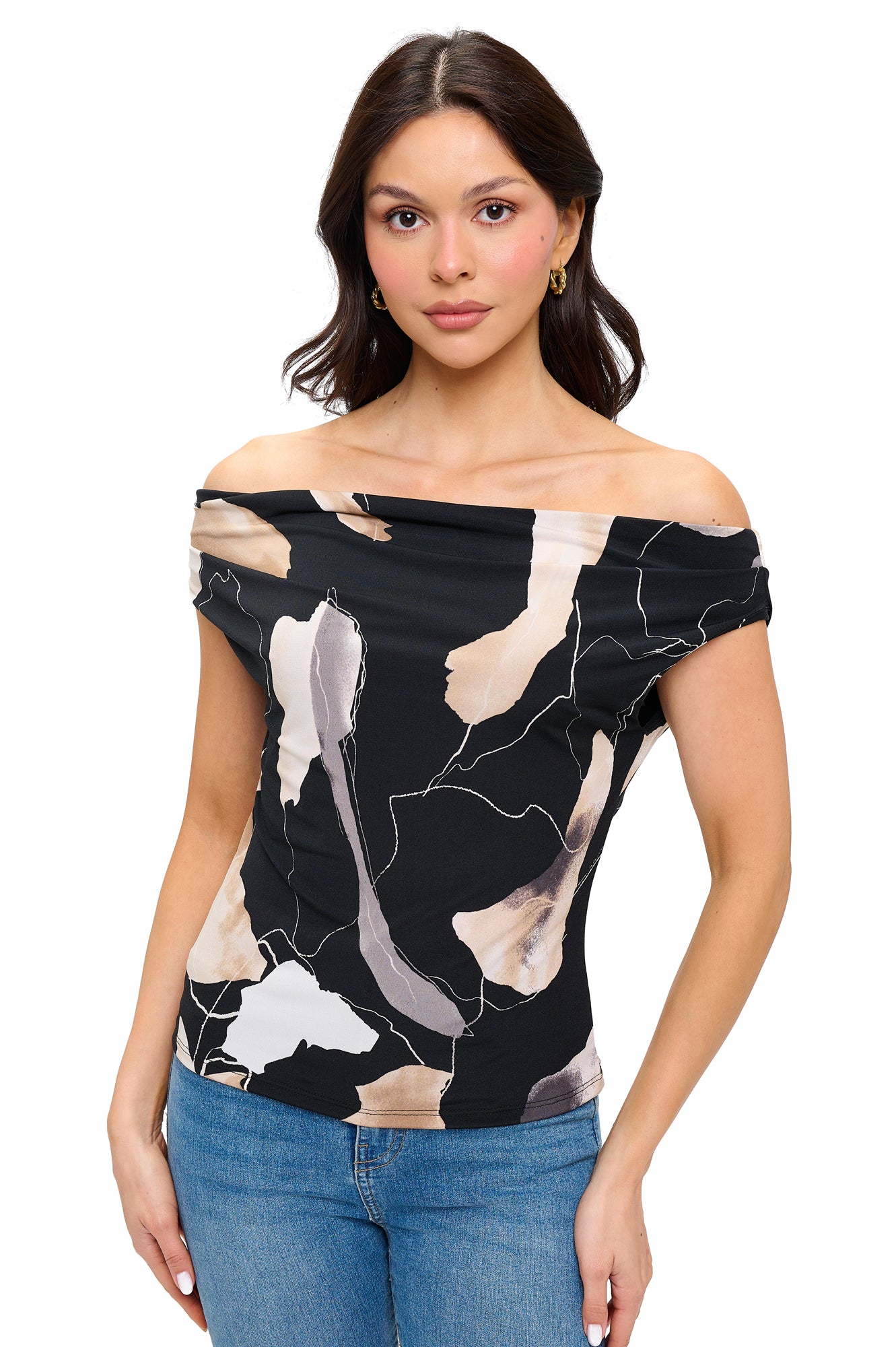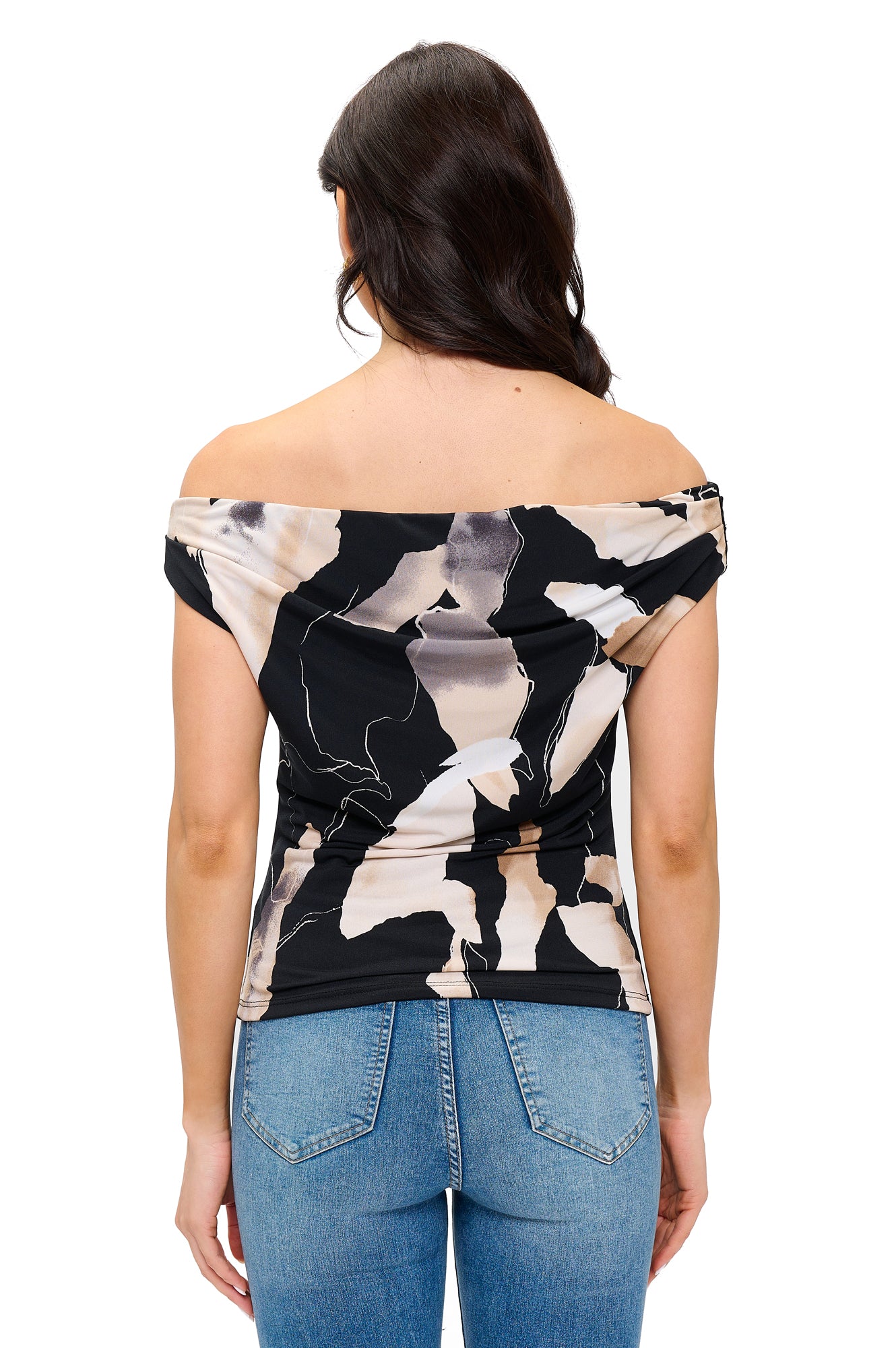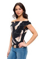 Make a vibrant statement in this stunning off-shoulder top. Designed with a bold, abstract print and crafted from comfortable, stretchy fabric, it effortlessly hugs your silhouette while providing all-day ease. The alluring off-shoulder neckline showcases your shoulders gracefully, adding a touch of feminine charm and contemporary elegance. Perfectly paired with jeans, shorts, or skirts, this eye-catching top brings fresh, artistic flair to any casual or dressy occasion.