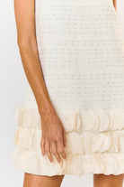 Elevate your style with this chic tweed mini dress featuring a unique 3D petal hem that adds playful volume and movement. The sleeveless design highlights a sleek silhouette, combining the timeless appeal of tweed with a modern twist—perfect for both daytime engagements and stylish evenings out.